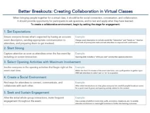 When bringing people together for a virtual class, it should be for social connection, conversation, and collaboration. It should provide an opportunity for participants to ask questions, and to test and apply what they have learned. To create a collaborative environment, begin by setting the stage for engagement. Download this handout to learn how to create more collaboration in virtual classes.