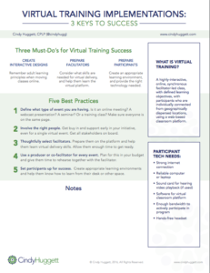 Featuring three must-do’s and five best practices for virtual training success. This checklist provides practical tips for virtual facilitators to design interactive classes, as well as how-to’s on preparing participants.