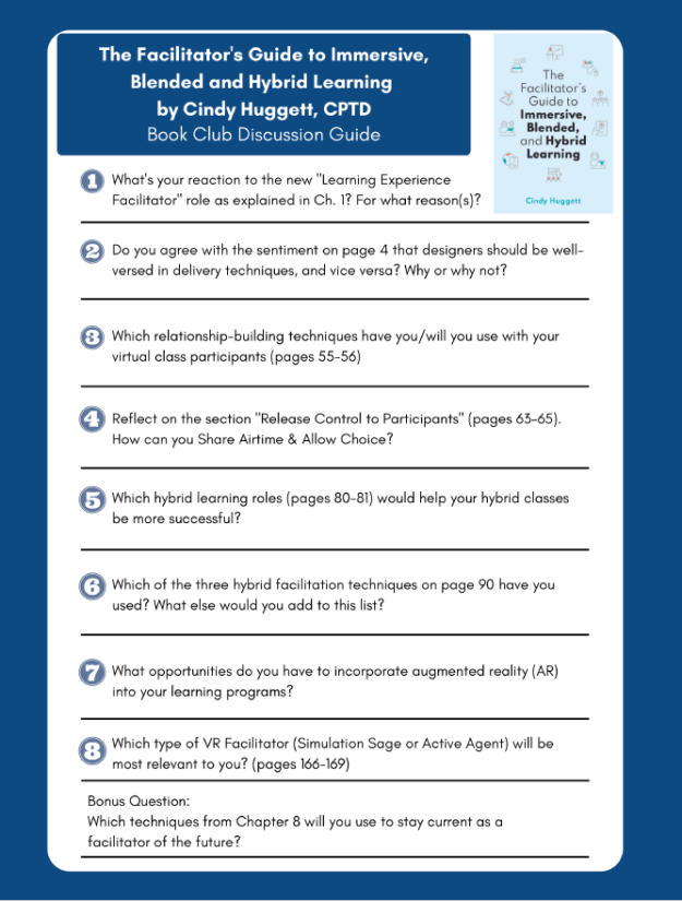 Leading a book club discussion? Use these curated questions to help guide your conversation around Cindy’s book, The Facilitator’s Guide to Immersive, Blended, and Hybrid Learning.