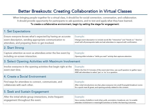 When bringing people together for a virtual class, it should be for social connection, conversation, and collaboration. It should provide an opportunity for participants to ask questions, and to test and apply what they have learned. To create a collaborative environment, begin by setting the stage for engagement. Download this handout to learn how to…