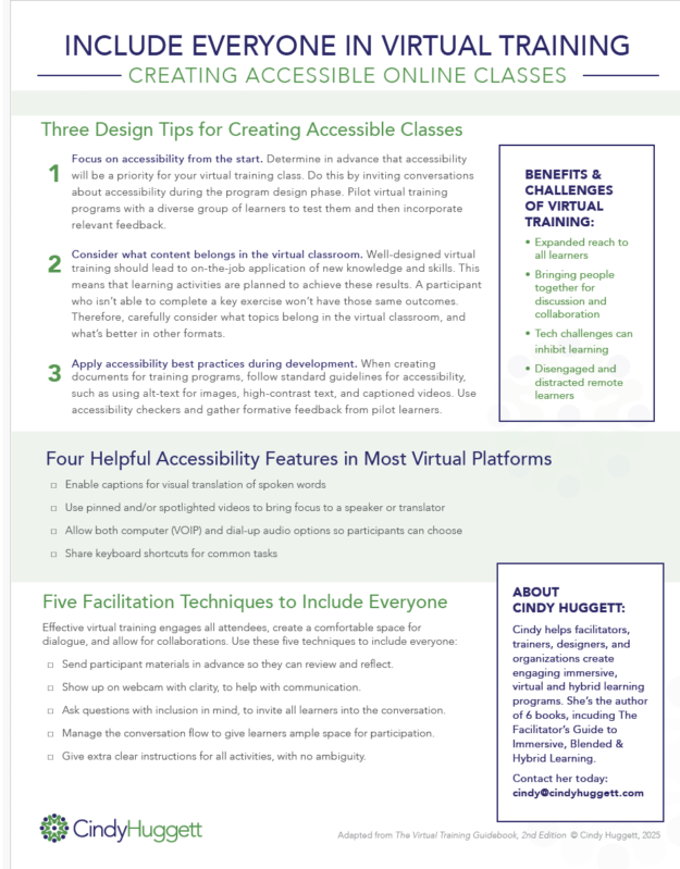 This handout summarizes key takeaways from Cindy’s session on Creating Accessible and Inclusive Virtual Training